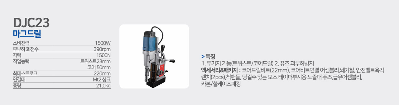 액세서리&패키지 : 코어드릴비트(22mm), 코어비트연결 어셈블리,쐐기철, 안전벨트육각 렌치(2pcs),척핸들, 당길수 있는 모스 테이퍼부시용 노즐대 퓨즈,급유어셈블리, 카본/철케이스패킹